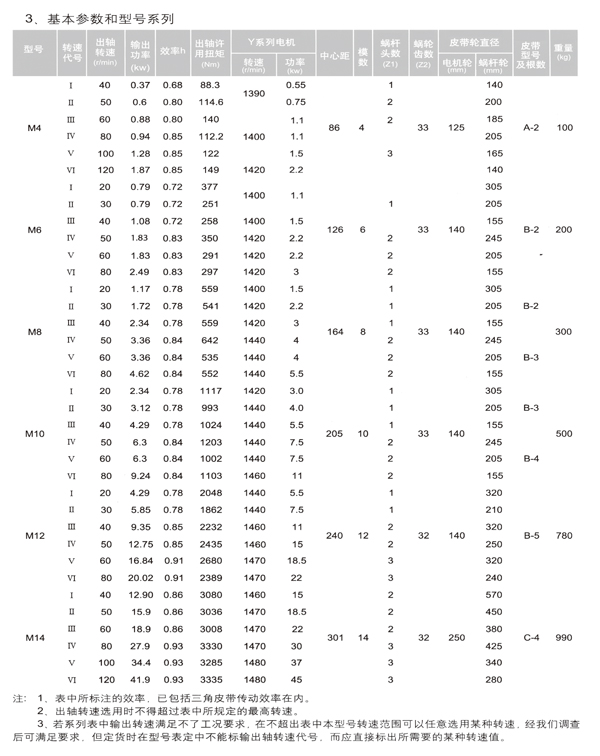 1.3選擇減速機型號時,要根據(jù)輸出軸轉速與輸出功率這兩個參數(shù)在表3-1中選擇型號。