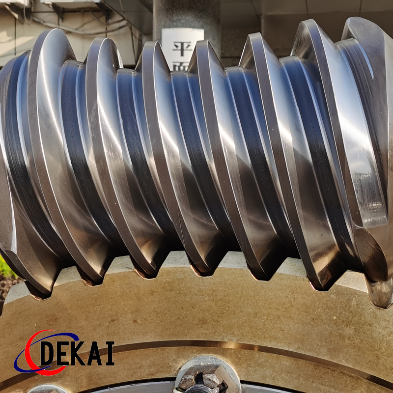 承載能力大:平面二次包絡(luò)環(huán)面蝸桿能多齒同時(shí)進(jìn)去嚙合,增大了接觸面積,減少了齒面壓力,承受大的沖擊載荷。蝸桿蝸輪的接觸線是沿齒高方向上,并且齒面的嚙合是在接觸線上,具有很小的相對(duì)曲率,使接觸應(yīng)力減少。蝸桿和蝸輪在嚙合中同時(shí)有兩條接觸線進(jìn)入工作區(qū)域。這種增加嚙合齒數(shù)一樣,可提高承載能力磨削的蝸桿齒面,表面粗糙度Ra0.8。高質(zhì)量的蝸桿幾何尺寸和表面粗糙度,保證耐磨防止大負(fù)荷時(shí)油膜破壞。蝸桿的齒面是經(jīng)過氮化熱處理后精制而成,齒面硬度HRC≥58,高硬度的蝸桿在設(shè)計(jì)上保證有足夠的剛性以致于他的彎曲和其它因素不影響上述嚙合特性。